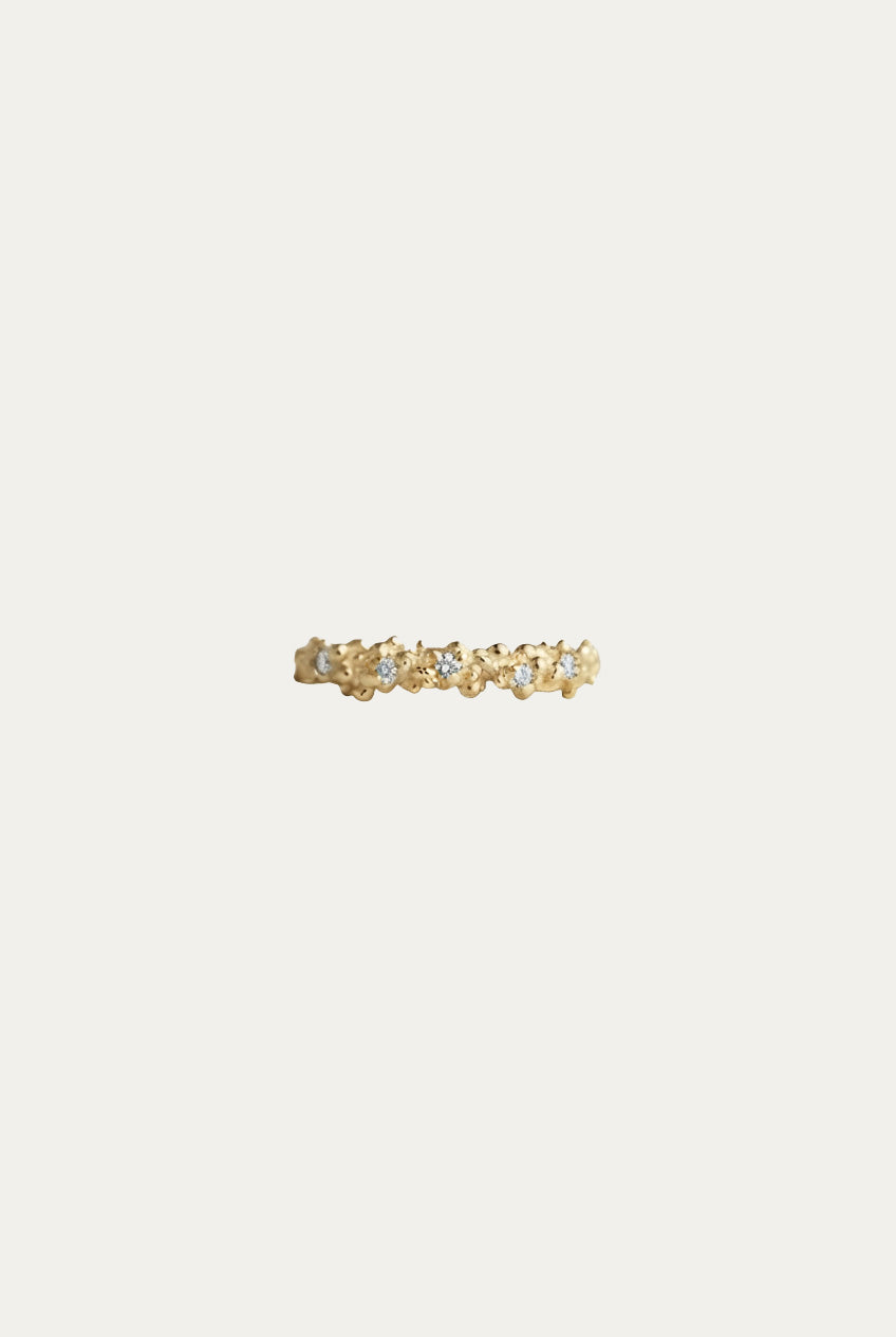 Handcrafted with our signature organic granulated texture, the band is set with five natural diamonds (H colour, VS2 clarity, approx. 1.5mm each), scattered like subtle sparks along the metal’s surface. Minimal yet radiant, it brings a calm luminosity to everyday wear.