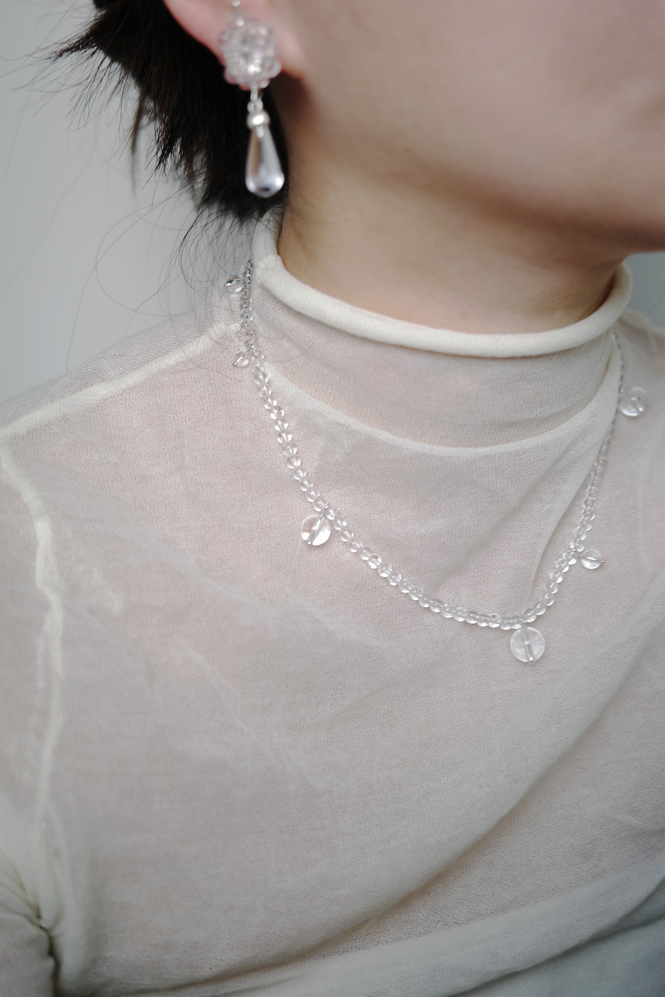 The teardrop form rests gently at the collarbone,